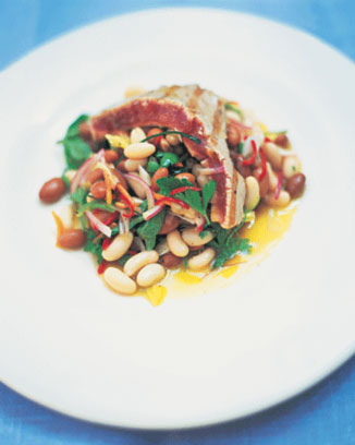 Это действительно красивое летнее блюдо, которое занимает едва ли времени, чтобы подготовиться - и, конечно же, вы можете использовать различные виды бобов, такие, как черная фасоль, флажолеты, масло бобов или даже чечевицу. Это потрясающий горячие закуски или основного блюда - и с тунцом все разорваны это делает большой салат. Я люблю сковородке тунца в течение минуты на каждой стор